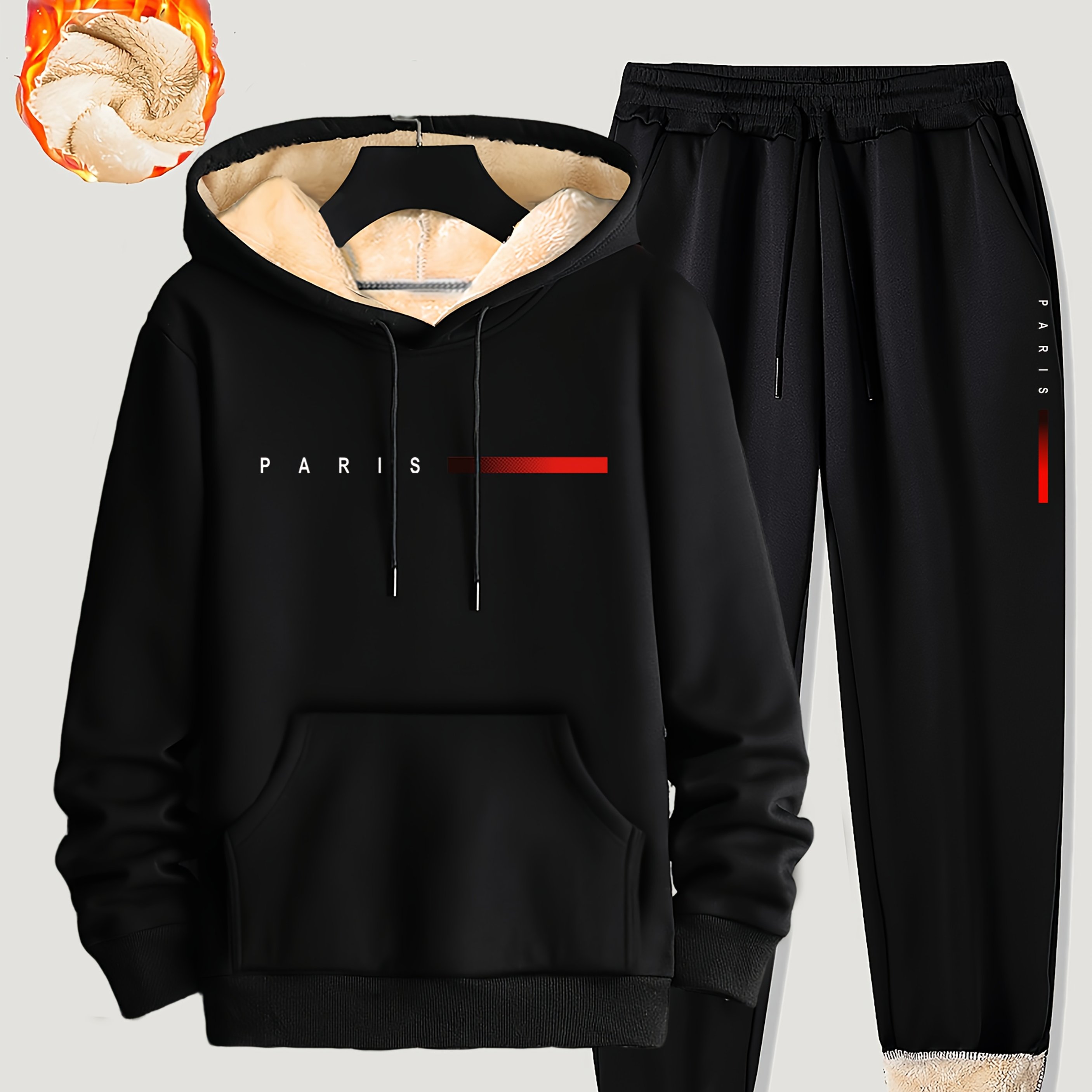 TEMU 남성용 파리 프린트 플리스 안감 2피스 조깅 슈트 세트 - 겨울용 따뜻한 후드티 & 캥거루 포켓 스웨트팬츠, 레터 P 패턴 매칭 아웃핏, 세탁기 사용 가능한 추운 날씨용 트랙수트