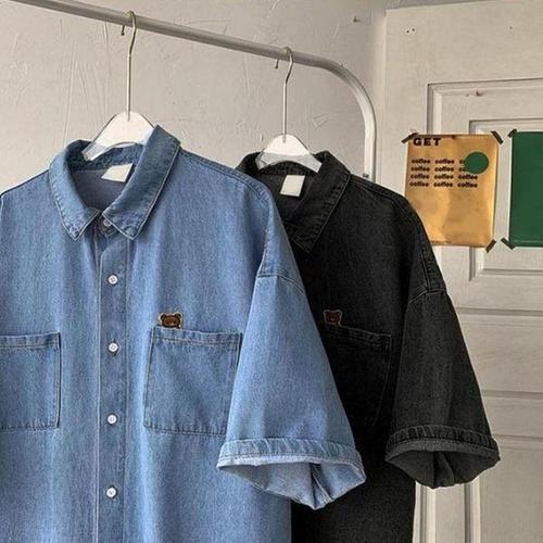 [셀러허브_여성트랜드패션]데일리 데님 남성 베어 흑청 셔츠 캐주얼 반팔티 나들이 여름 중청