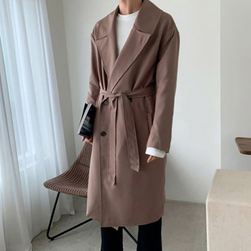 에이치베이직 남자 구김없는 오버핏 롱 트렌치 로브 바바리 벨트 코트 봄 가긴