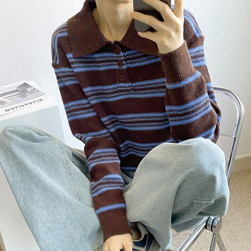 [기타브랜드]빈티지 무드 브라운 블루 스트라이프 카라니트
