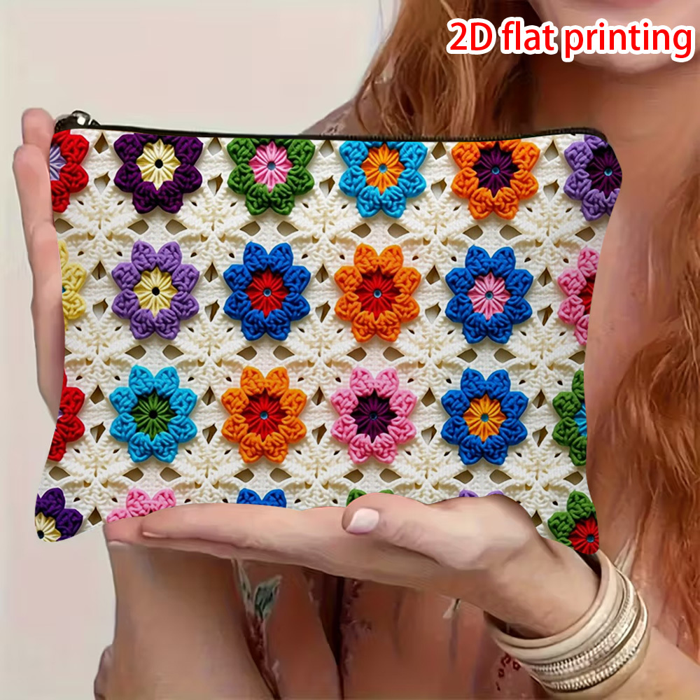 TEMU 크로셰 꽃 화장품 가방 1개, 여행 및 선물용, 부드러운 원단과 2D 평면 크로셰 꽃 패턴, 일상용으로 휴대하기 편한 컴팩트한 크기 - 크로셰 디자인, 2D 평면