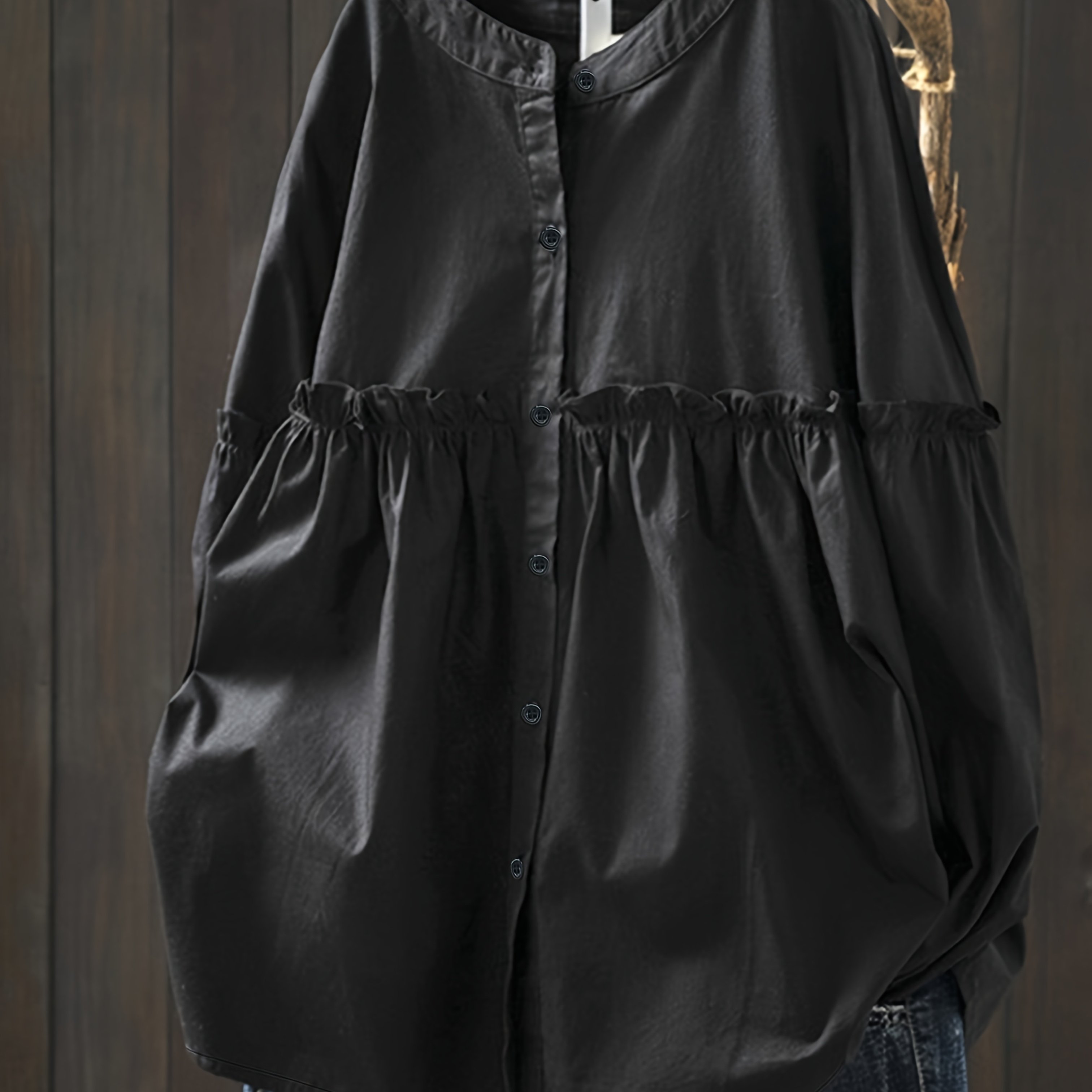 TEMU 슬림핏 3/4 소매 러플 소매 블라우스 - 숏 블랙 셔츠 재킷, 라운드 넥 칼라 캐주얼에서 드레시 탑, 기계 세탁 가능 올시즌 다용도 아우터웨어 청바지 & 드레스용