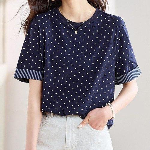[핑크엘리제]라운드넥 네이비 도트 반팔티 네이블반팔티