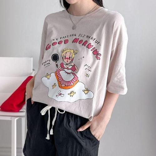 [에이치플러스몰]루즈핏 노랑머리 삐삐 굿모닝 반팔 롱 티셔츠 홈웨어
