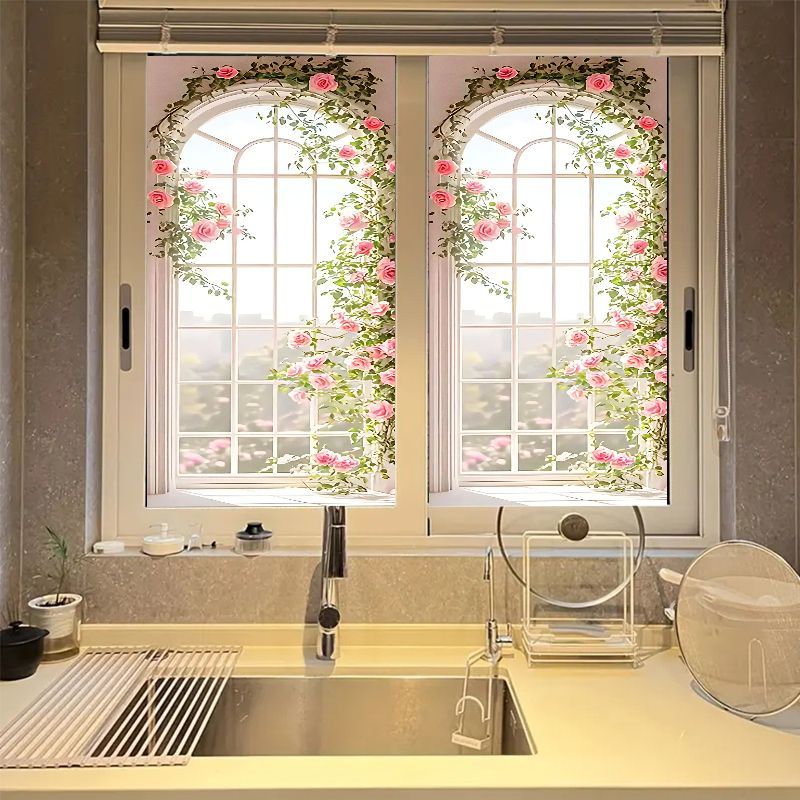 TEMU 2D 플랫, 1개 2D 플랫. 우아한 장미 꽃무늬 창문 필름, 탈부착 가능한 정전기 유리 스티커, 프라이버시 장식용 홈 데코. 유리 필름, 2D 플랫