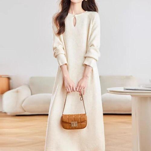 AOUGK 여자 골지 롱 니트 원피스 반폴라 롱원피스 슬림핏 니트원피스 가을 겨울 원피스 데일리