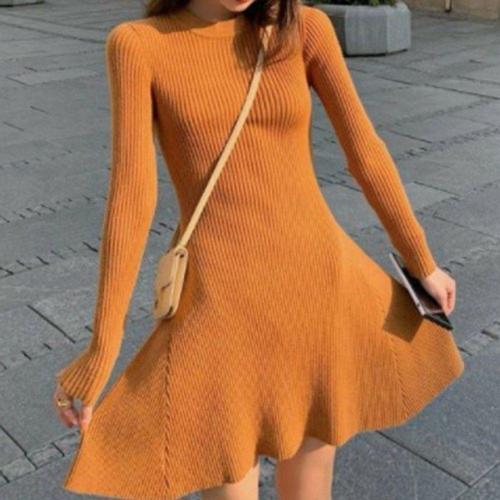 슬림 여성스러운 플레어 니트 넥라운드 미니 원피스