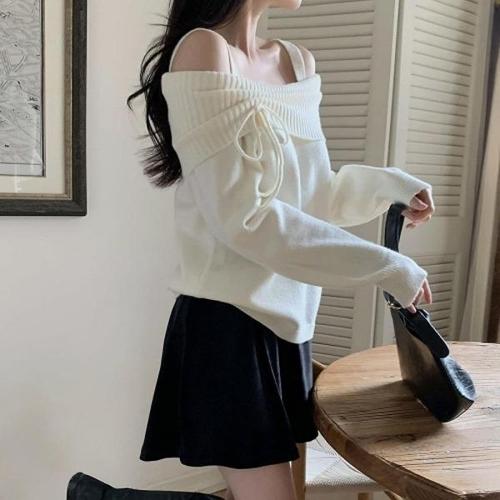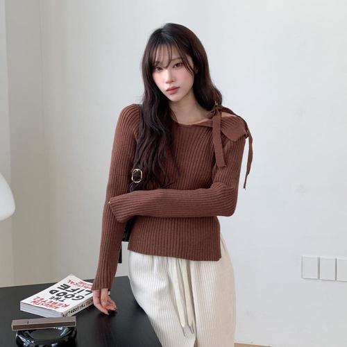 [다잇템][다잇템] 여성 슬림 잔주름 리본 볼드숄더 숄더 니트_23909550_588872