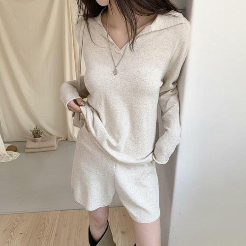 슬림소녀 여성 춘추 캐주얼한 분위기의 브이넥 투피스 고급스러운 꽈배기 짜임 니트 긴팔 반바지 세트