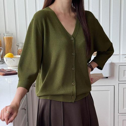[기타브랜드]차분한 카키 브이넥 가디건 담백한 감성의 데일리 니트룩