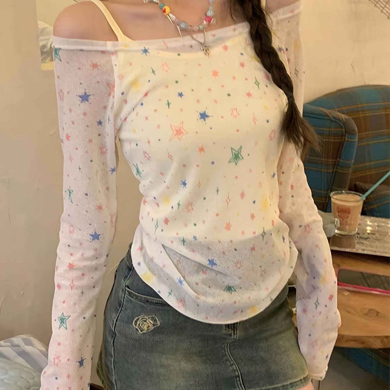 TEMU 스위트 앤 쿨 오프숄더 긴팔 별 패턴 경량 커버업 캐미솔 세트, 순수한 욕망 투피스 의상