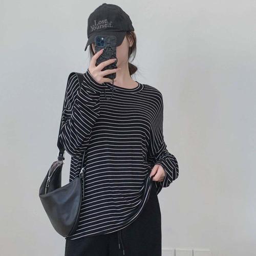 여성 얇은 줄무늬 스트라이프 니트 반팔 긴팔 티 티셔츠 여자 여름 봄 가을 긴팔 기본 라운드 빅사이즈 루즈핏 박스티 오버핏 큰옷 옷