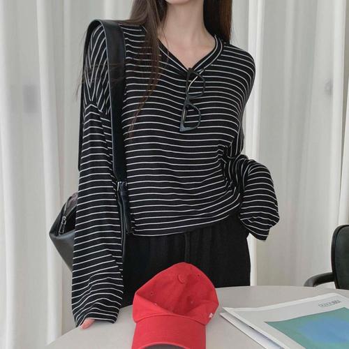 여성 귀여운 백리본 볼드숄더 줄무늬 긴팔티