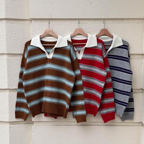 여성 긴팔티 카라넥 FW 줄무늬 니트티