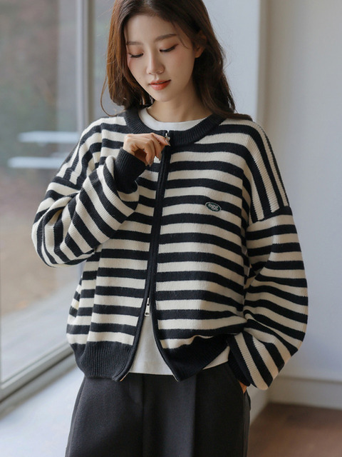 [MAXZA] 멀티 스트라이프 버튼 니트 가디건