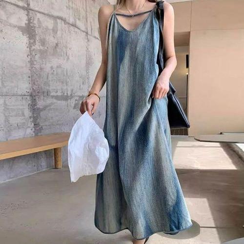 [에이치플러스몰]여성 꾸안꾸 데님 나염 V넥 루즈핏 민소매 롱원피스