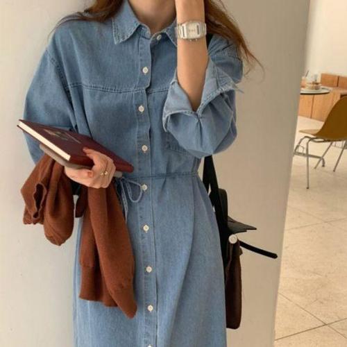 POMTOR 여성 춘추 루즈핏 데님 롱 원피스 가을 청 원피스