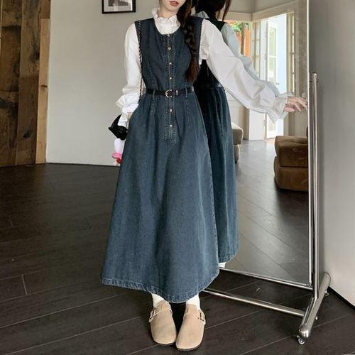 [디어로우]오칸 프릴 블라우스 데님 롱 원피스 세트