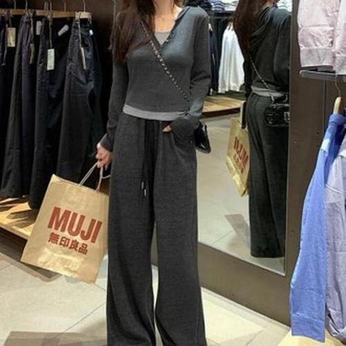 러브포텐 빅사이즈 여성 브이넥 니트 상하세트 봄 가을 오버핏 와이드팬츠 V넥 긴팔롱티 투피스세트 루즈핏 데일리 트레이닝복세트