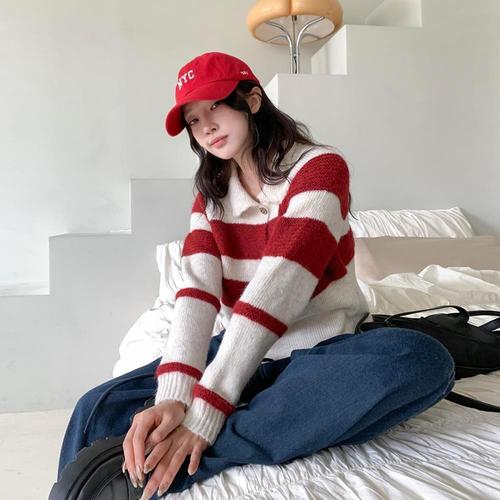 [옷자락]여자 빈티지 배색 단가라 카라넥 도톰 니트 가디건