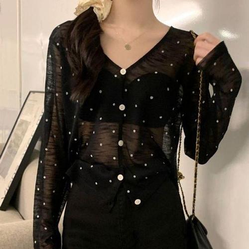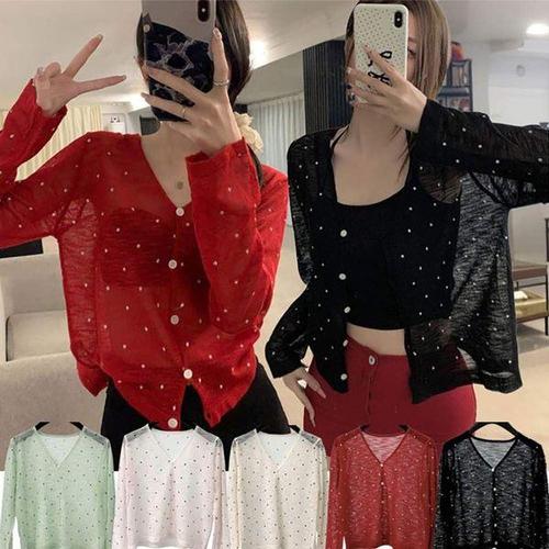 [에이치플러스몰]도트 니트 여름 긴팔 시스루 여성 가디건 카디건