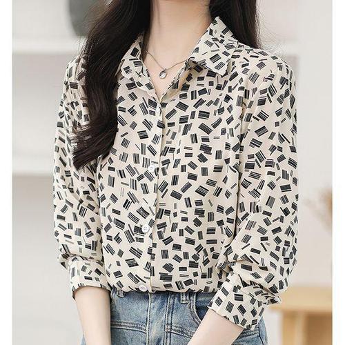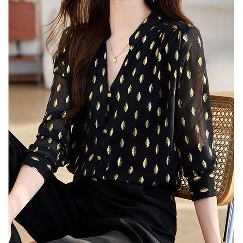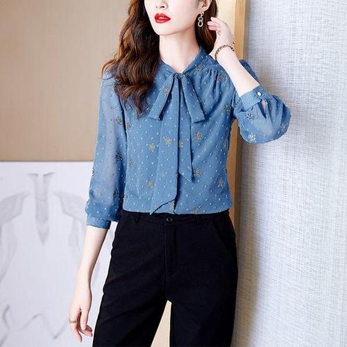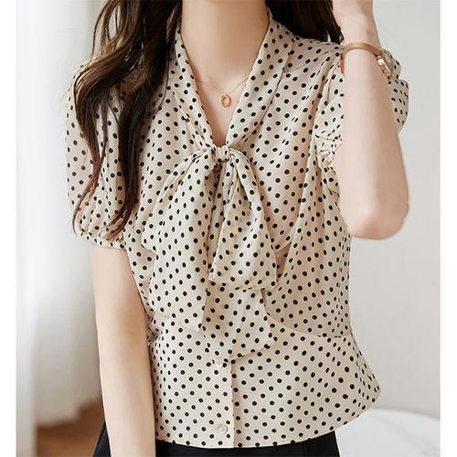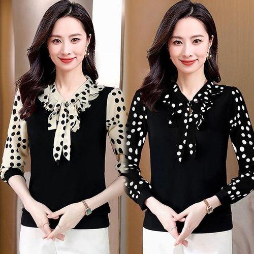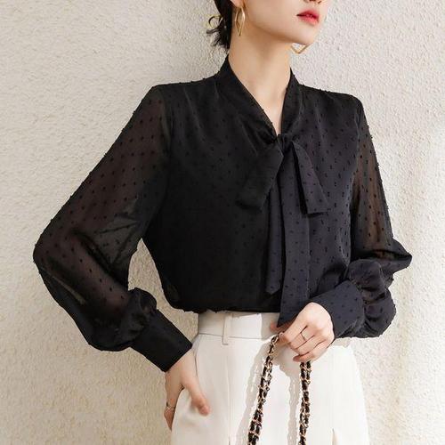 지고다그 1+1 여성 봄가을 쉬폰 블라우스 도트 패턴 리본 타이 긴팔 우아한 셔츠 SX68459
