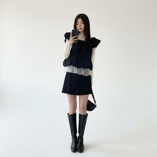 애니파니 반팔 복고 도트 어깨 퍼프 뒤 리본 블라우스
