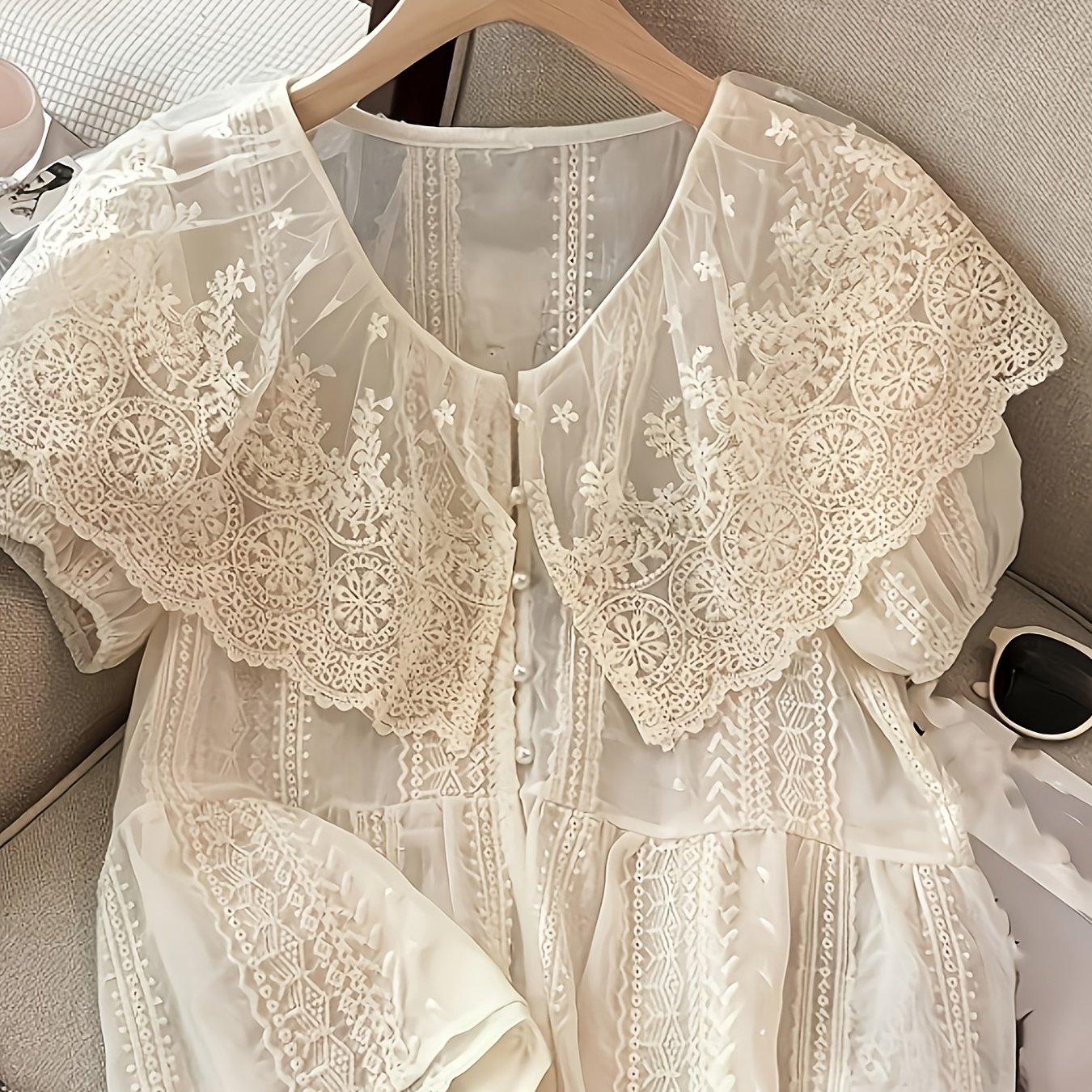 TEMU 유럽&미국 여성 캐주얼 봄/여름 패션 드레스 - 레이스 V넥, 반소매, 레이스 커프스, 편안한 핏, 우아한 헤밍 웨이브 엣지 나이트가운 맥시 드레스