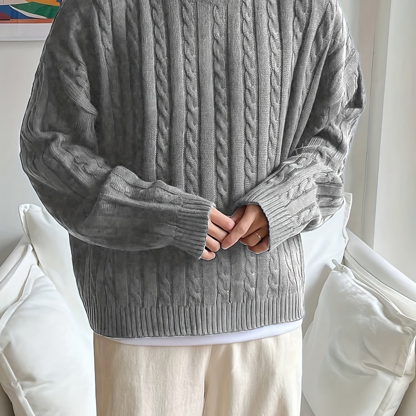 TEMU Inchantu 남성용 오버사이즈 스웨터 - 단색 라운드넥 드롭 숄더 니트 풀오버, 캐주얼웨어에 적합한 루즈핏 겨울 스웨터, 사무실, 레이어링, 일상용으로 세탁기 사용 가능한 따뜻한 스웨터