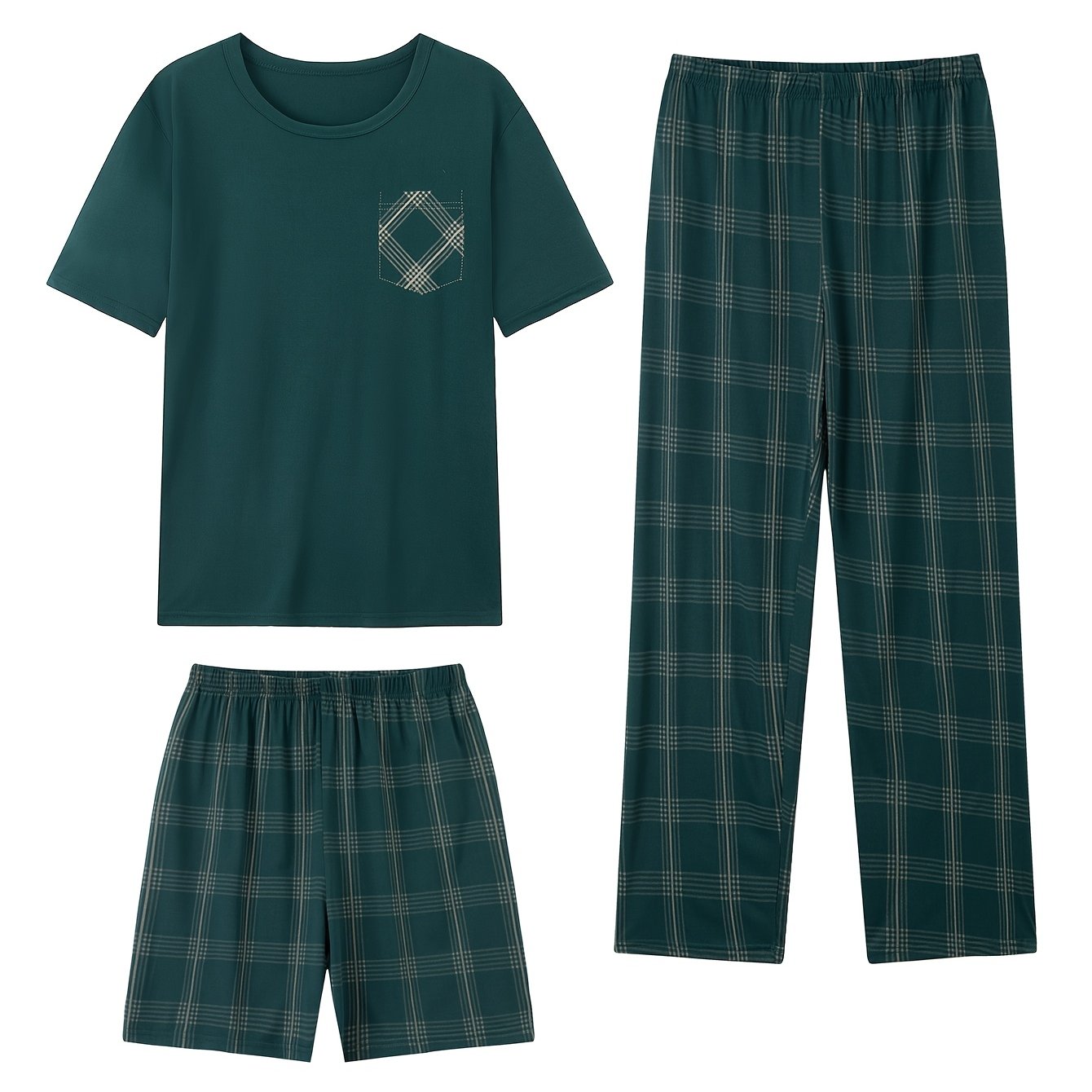TEMU 남성용 여름 잠옷 3pcs - 반팔 라운드넥 파자마 & 매칭 반바지, 통기성 좋은 캐주얼 나이트웨어