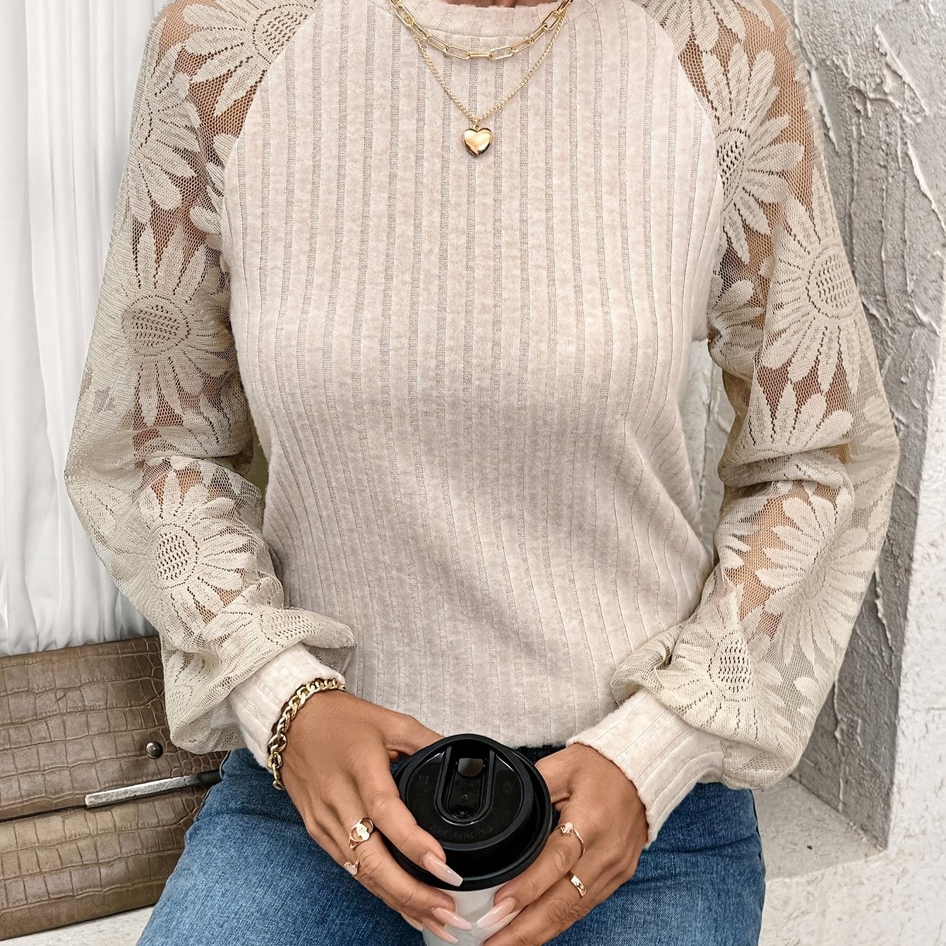 TEMU 골지 인터로킹 레ース 라운드 넥 래글런 소매 긴팔 상의