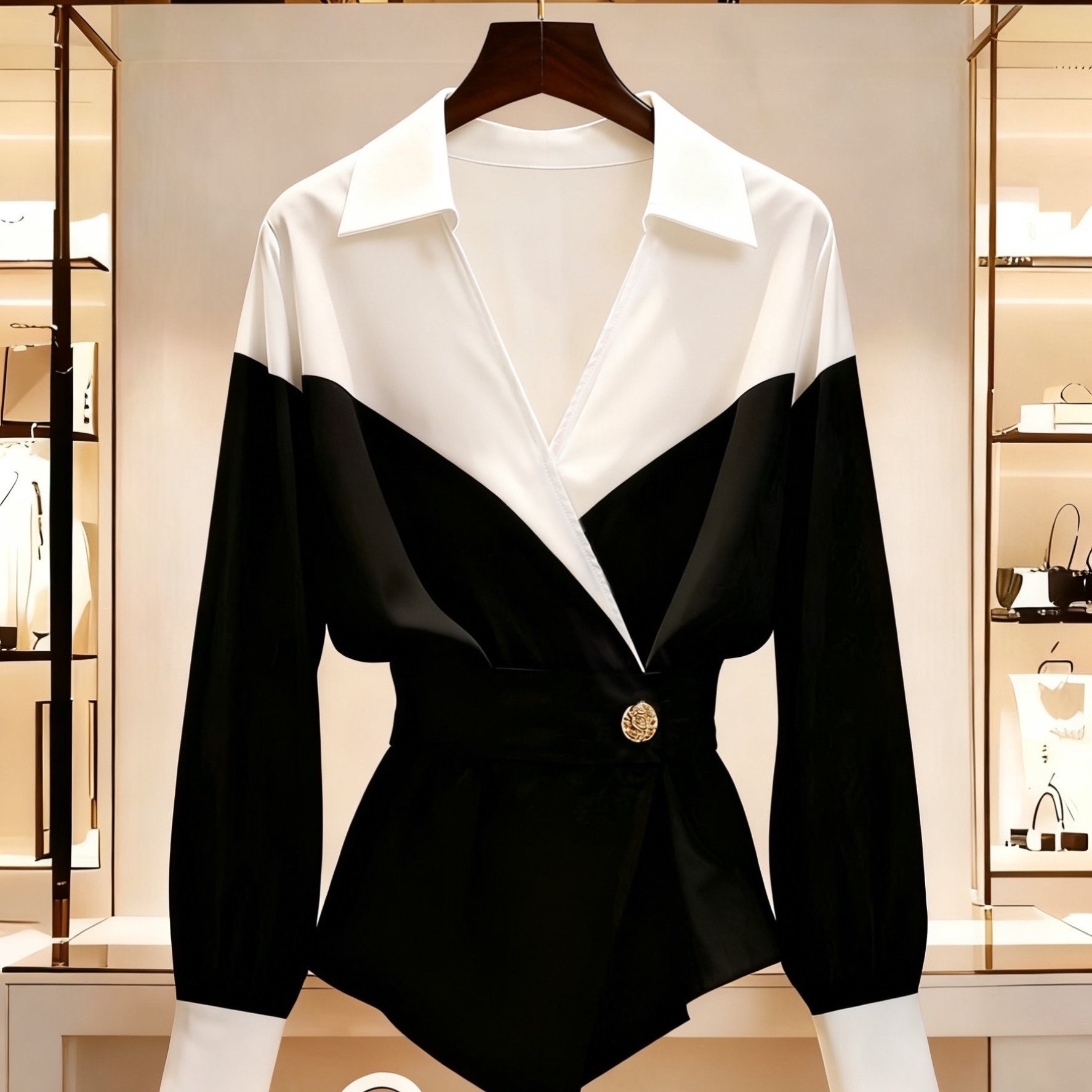 TEMU 여성용 우아한 프렌치 스타일 컬러 블록 블라우스 - V넥 긴팔 셔츠, 대비 효과, 버튼 앞면 클로저, 올 시즌 오피스 & 캐주얼 웨어, 다용도 패션, 세련된 스타일, 스타일리시 탑, 패션 애호가