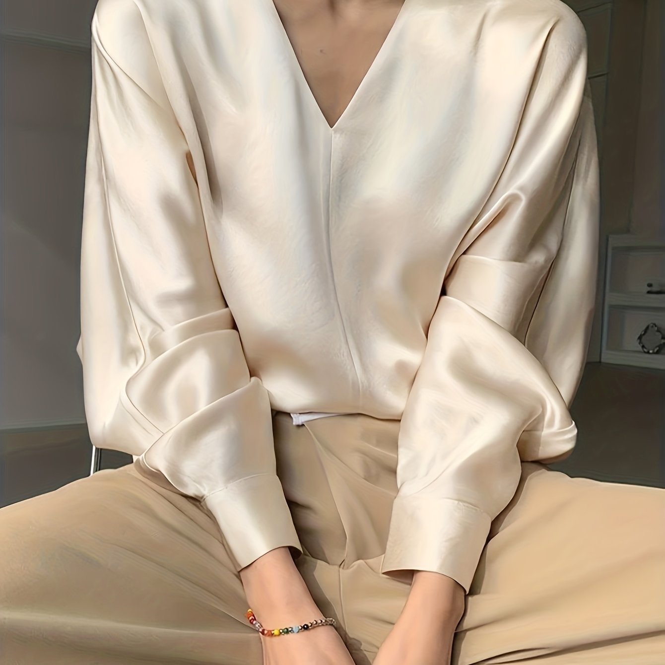 TEMU 여성용 우아한 V넥 긴팔 블라우스 - 루즈핏 버튼 앞면 셔츠, 사계절 오피스 & 파티 블라우스 (소프트/샴페인 색상), 캐주얼 & 포멀, 전문 여성, 내구성 좋은 소재, 클래식 디자인, 직장복, 패션을 즐기는 여성|오피스룩