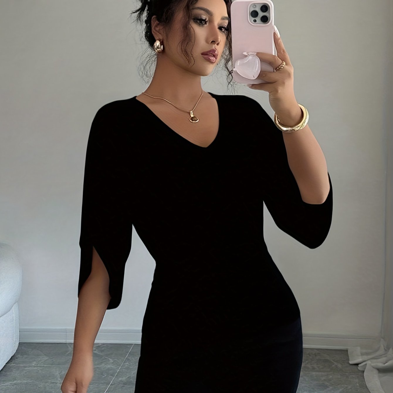 TEMU 여성용 플러스 사이즈 V넥 슬릿 디테일 탑 - 신축성 반투명 우아한 블라우스, 봄/가을 캐주얼 & 포멀 웨어, 가을 옷장, 시크 스타일, 통기성 니트웨어, 오피스 의류
