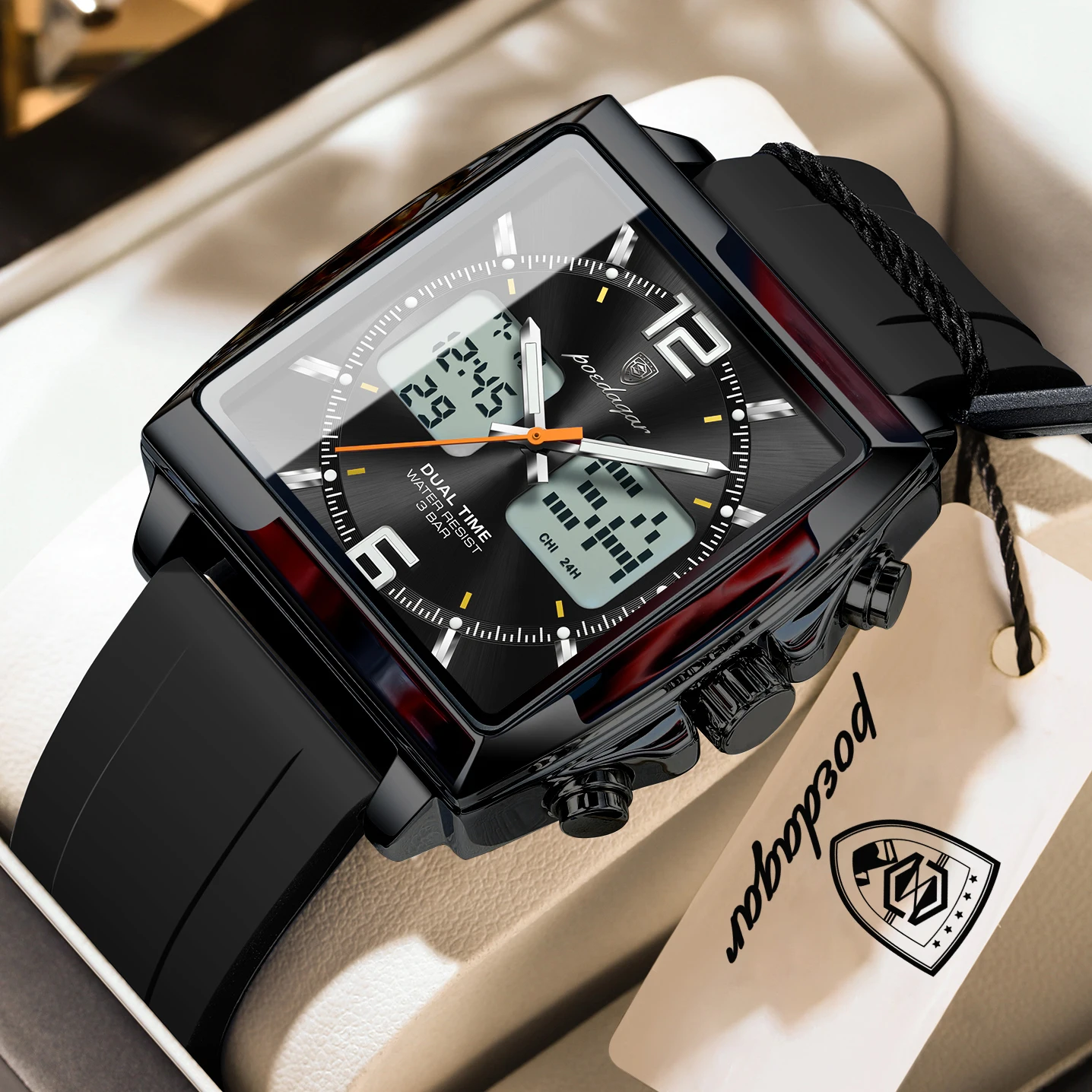 포에다가 러버스 워치 전자식 사각 LED 알람 크로노그래프 남성용 시계 주간 날짜 듀얼 타임 디스플레이 남성 쿼츠 손목시계