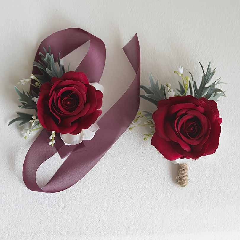TEMU 2개 세트 모조 장미 꽃 | 신랑 친구의 가슴 장식 꽃, 신부 친구의 손목 장식 꽃 (리본 포함), 결혼식 장식, 댄스 파티 및 공식 행사에 적합