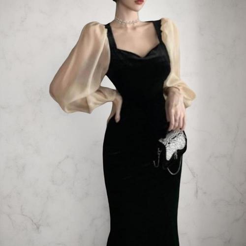 [옷자락] 여성 벨벳 레이어드 쉬폰 퍼프 소매 슬림 롱 드레스