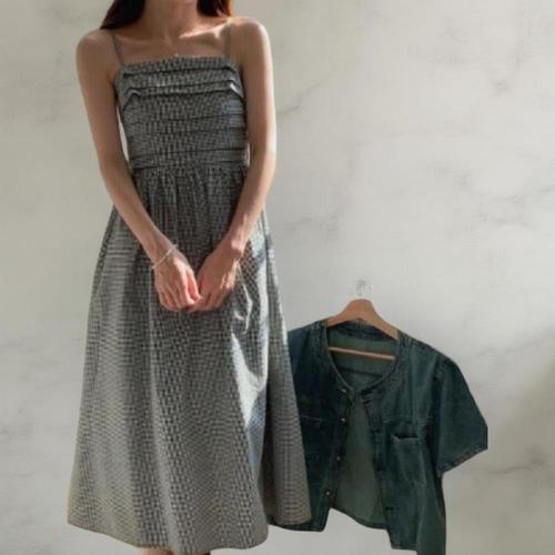 [다잇템]여성 코르셋 리조트룩 스트랩 격자 롱드레스