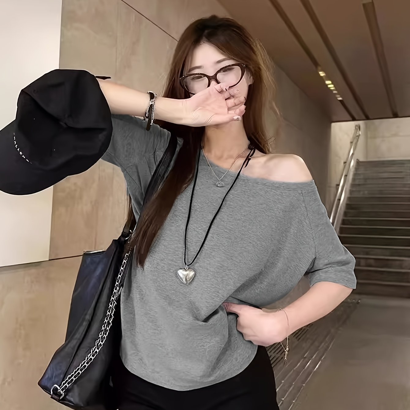 TEMU 여성용 Y2K 여름 오프숄더 스트레치 티셔츠 - 고탄력 루즈핏 탑, 딥 그레이 캐주얼 시크 반팔 블라우스, 다재다능한 패션, 디프넥 디자인, 신축성 원단