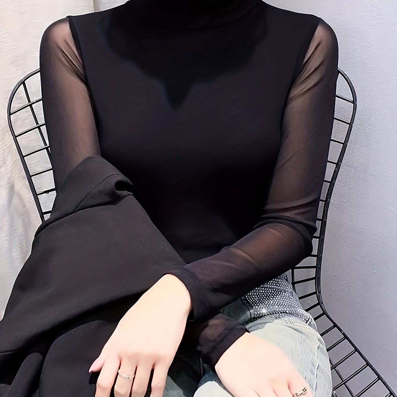 TEMU 메쉬 패널 장식의 우아한 하이넥 블ouses - 단색 신축성 있는 블랙 상의, 기계 세탁 가능, 레이어드, 사무실, 캐주얼 및 평상복용으로 적합