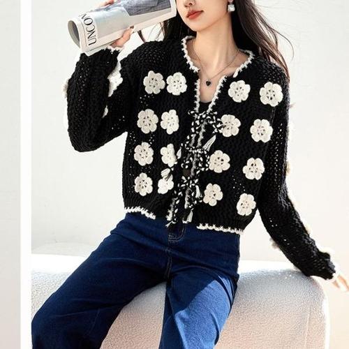 [신상오픈런]여성 꽃무늬 자수 손뜨개 라운드넥 울 니트 가디건