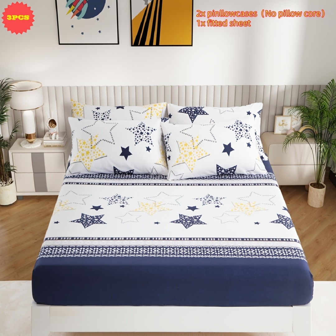 TEMU 3피스 기하학적 오각별 라인 그래픽 프린트 침구 세트, 부드럽고 편안한 침실 및 게스트룸용, 한 장의 매트리스 커버 + 두 개의 베개커버 포함, 충전재 없음