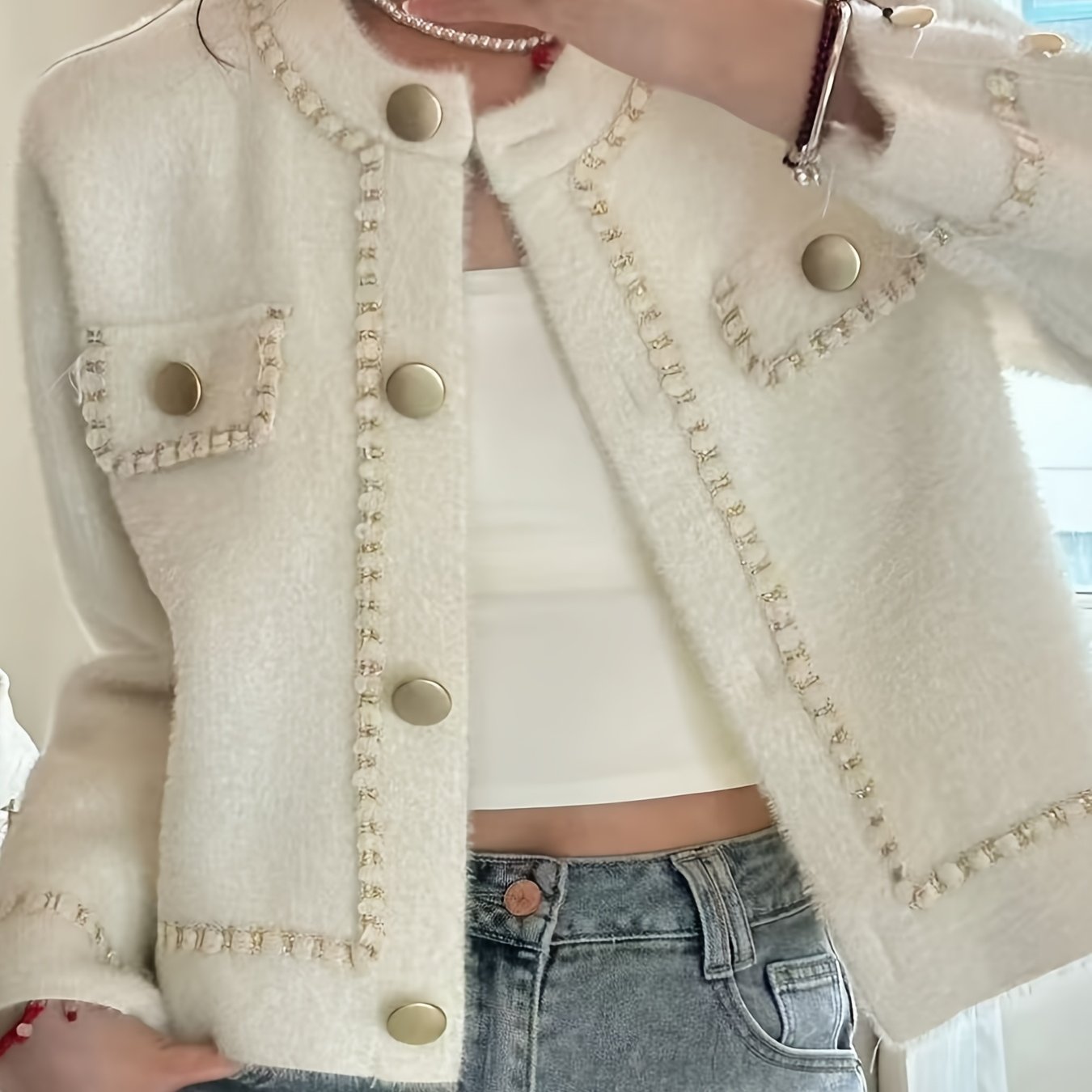 TEMU 화이트 셀럽 인품 하이엔드 패션 감각, 작은 향기 스타일 긴팔 니트 재킷 여성용 신상 클래식 이지 라운드넥 긴팔 탑