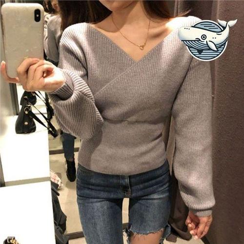 [에이치플러스몰]브이넥 골지 랩 니트 티셔츠 신축성 벌룬스타일 여성