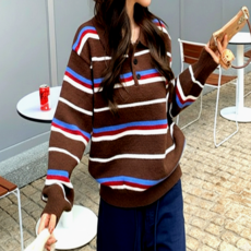밸로아 럭비니트 여성 단가라 카라 스트라이프 오버핏 맨투맨
