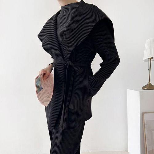 [신상오픈런]여성 도톰 하프 자켓 벨트 플리츠 빅 숄카라 블랙