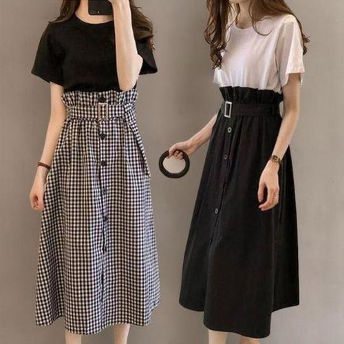 [신상오픈런]여성 단색 반팔 티셔츠 벨트 A라인 치마 투피스 세트
