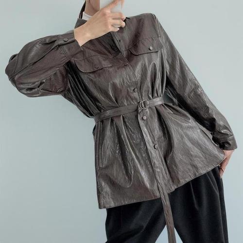 아일레고고 봄 가을 여성 빈티지 스트리트웨어 루즈 벨트 싱글 버튼 긴팔 인조 가죽 재킷 아우터웨어
