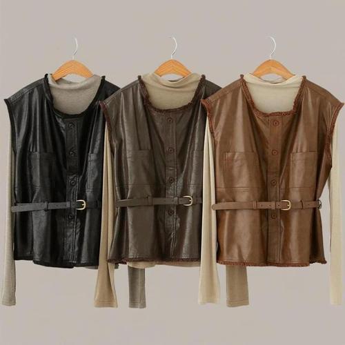 [신상오픈런]여성 가죽 자켓 수술 포켓 벨트 버튼 목폴라 세트 (41503009)