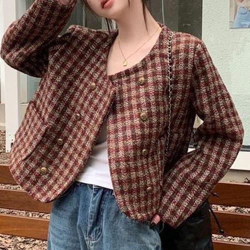 [엄지척]체크크롭자켓 레드 브라운 색상 트위드 카라없는 자켓_20342831_667501